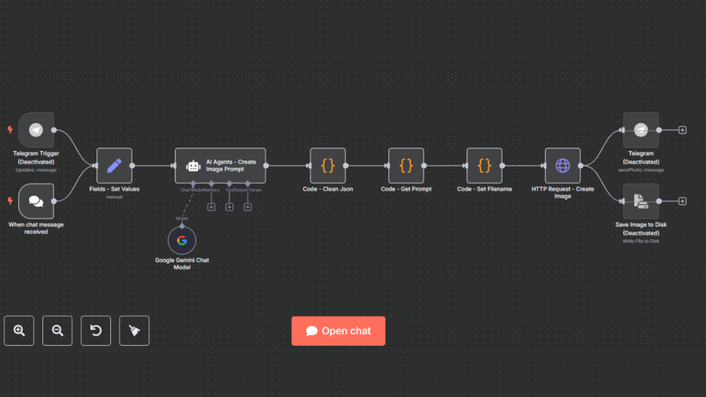 - The flow is triggered by a chat message in n8n or via Telegram. The default image size is 1080 x 1920 pixels. To use a different size, update the values in the Fields - Set Values node before triggering the workflow.