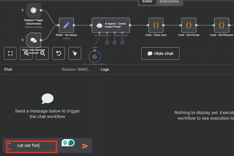 - The flow is triggered by a chat message in n8n or via Telegram. The default image size is 1080 x 1920 pixels. To use a different size, update the values in the Fields - Set Values node before triggering the workflow.